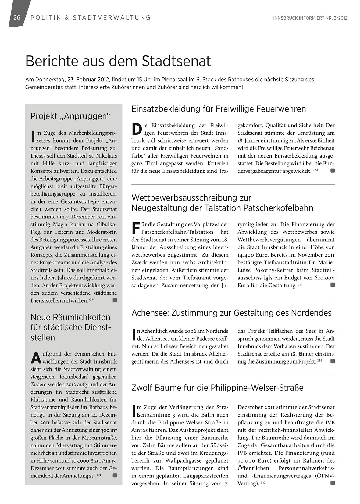Am Donnerstag, 23. Februar 2012, findet um 15 Uhr im Plenarsaal im 6. Stock des Rathauses die nächste Sitzung des