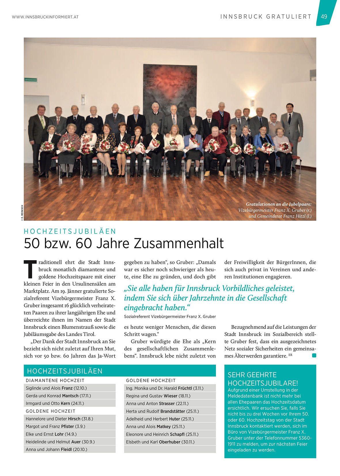 raditionell ehrt die Stadt Innsbruck monatlich diamantene und