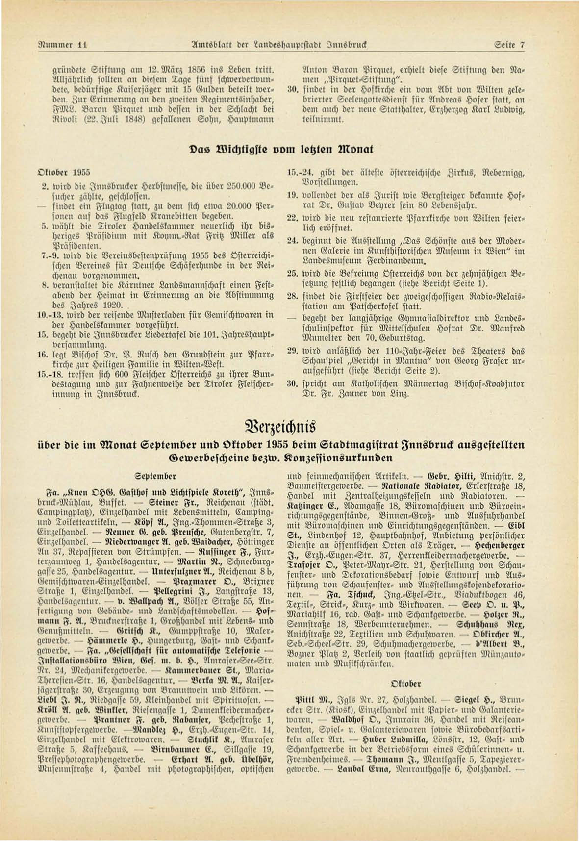 über die im Monat September und Oktober 1955 beim Stadtmagistrat Innsbruck ausgestellten
