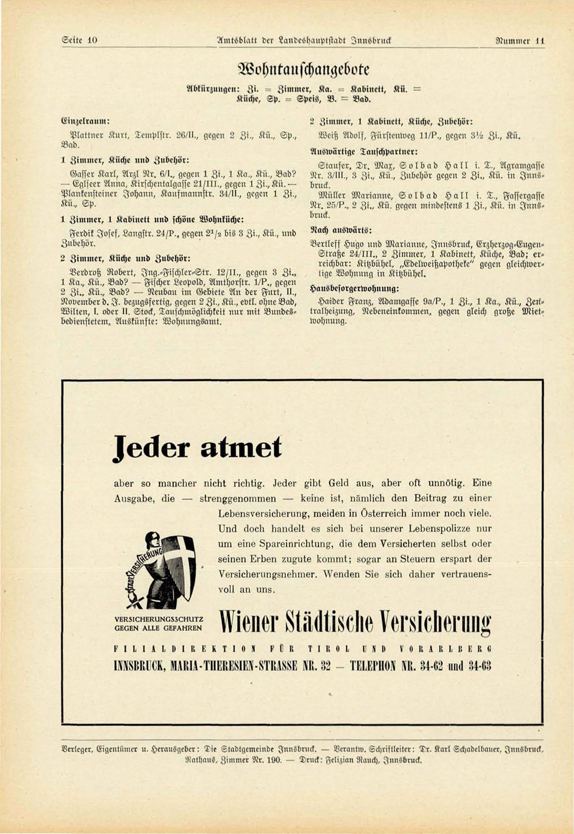 Verleger, Eisscntüincr u. Herausgeber: Tie Stadtsscmeinde Innsbruck. — Vcrantw. Schriftleiter: Tr. Karl Echadrlbanrr, Innsbruck,
