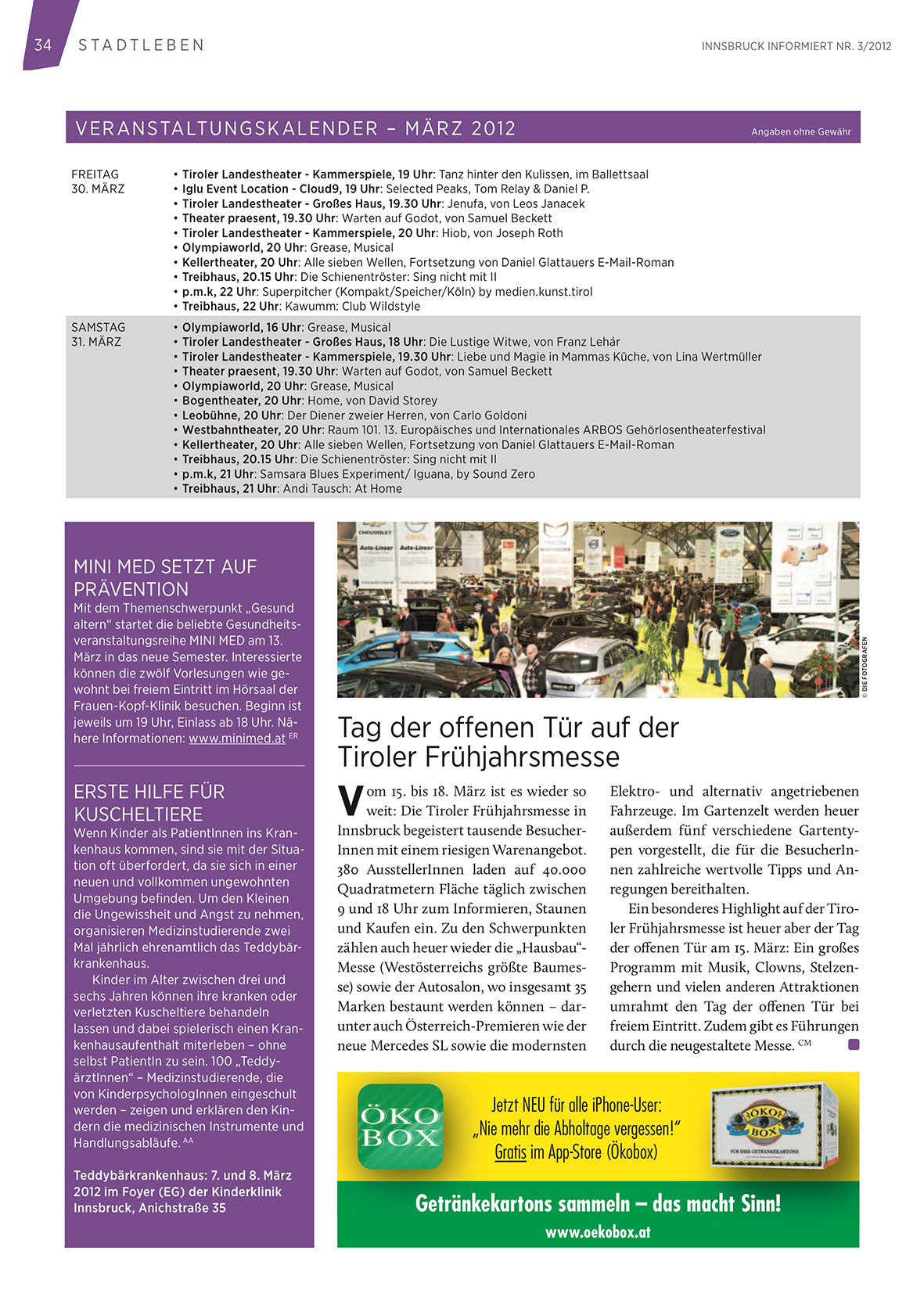 zählen auch heuer wieder die „Hausbau“Messe (Westösterreichs größte Baumesse) sowie der Autosalon, wo insgesamt 35