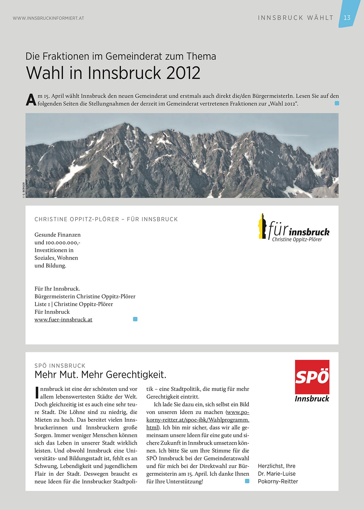m 15. April wählt Innsbruck den neuen Gemeinderat und erstmals auch direkt die/den BürgermeisterIn. Lesen Sie auf den