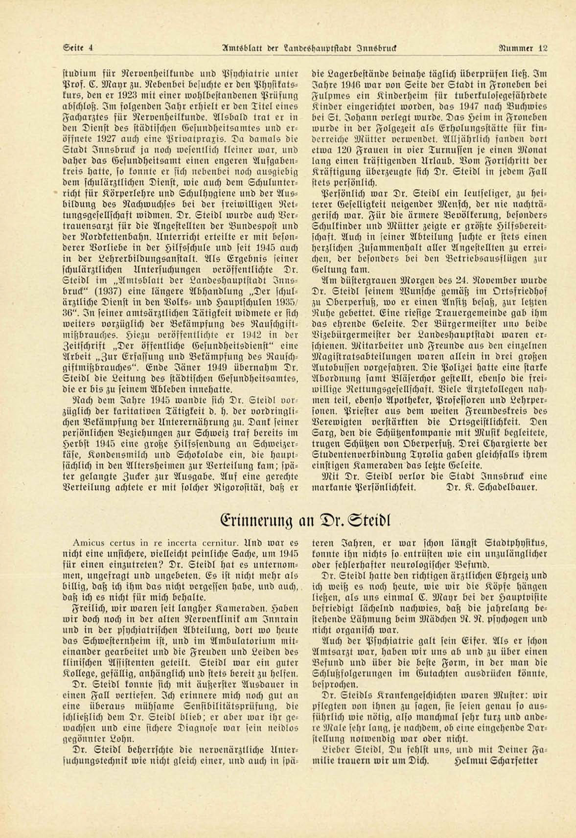 Steidl im „Amtsblatt der Landeshauptstadt I n n s bruck" (193?) eine längere Abhandlung „Der schulärztliche Dienst in den Volks- und Hauptschulen 1935/