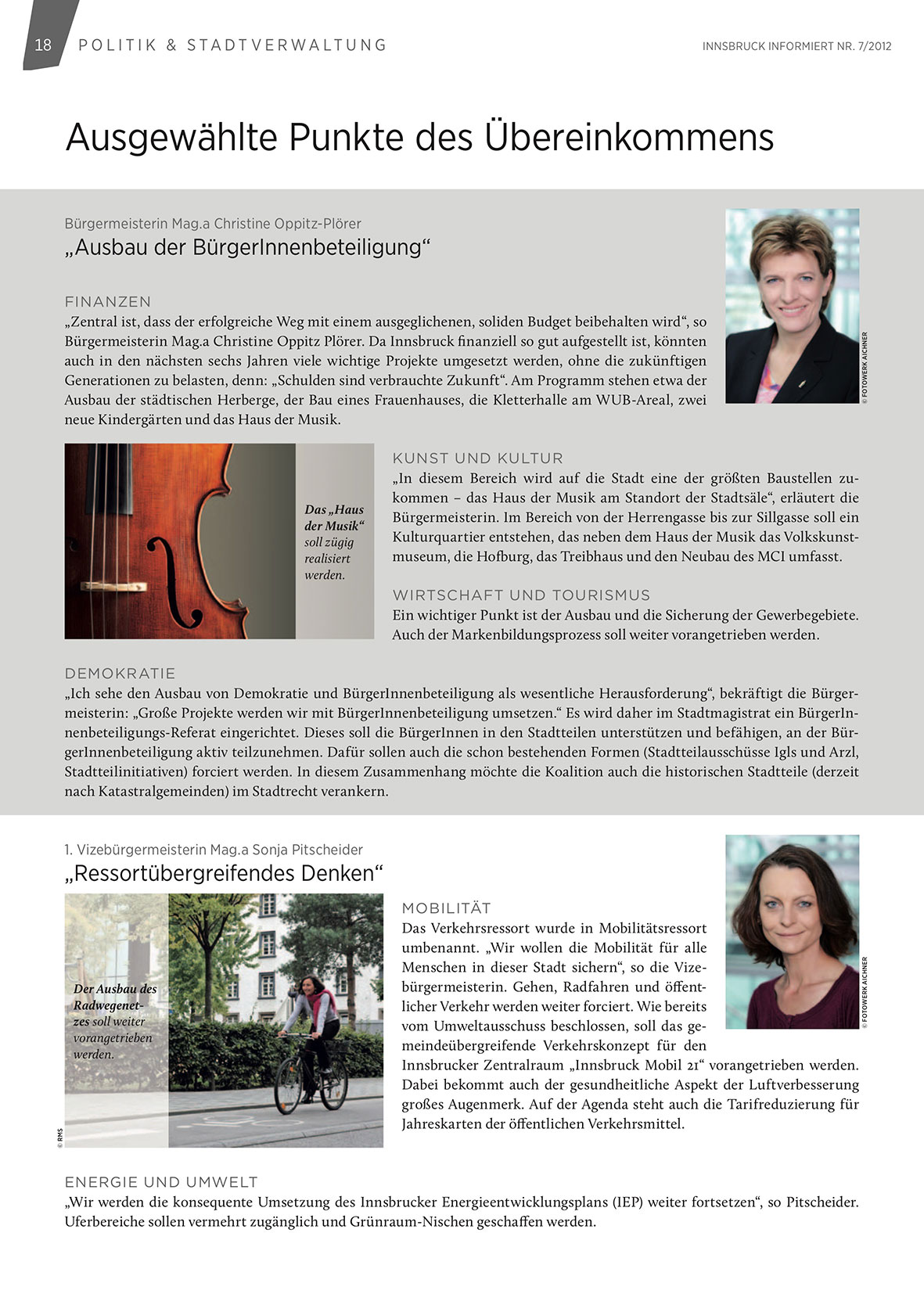 „Ich sehe den Ausbau von Demokratie und BürgerInnenbeteiligung als wesentliche Herausforderung“, bekräftigt die Bürgermeisterin: „Große Projekte werden wir mit BürgerInnenbeteiligung umsetzen.“ Es wird daher im Stadtmagistrat ein BürgerInnenbeteiligungs-Referat eingerichtet. Dieses soll die BürgerInnen in den Stadtteilen unterstützen und befähigen, an der BürgerInnenbeteiligung aktiv teilzunehmen. Dafür sollen auch die schon bestehenden Formen (Stadtteilausschüsse Igls und Arzl,