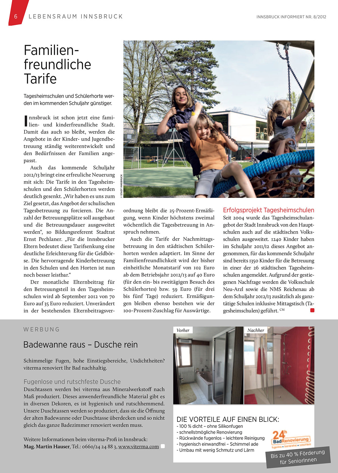 Seit 2004 wurde das Tagesheimschulangebot der Stadt Innsbruck von den Hauptschulen auch auf die städtischen Volksschulen ausgeweitet. 1240 Kinder haben