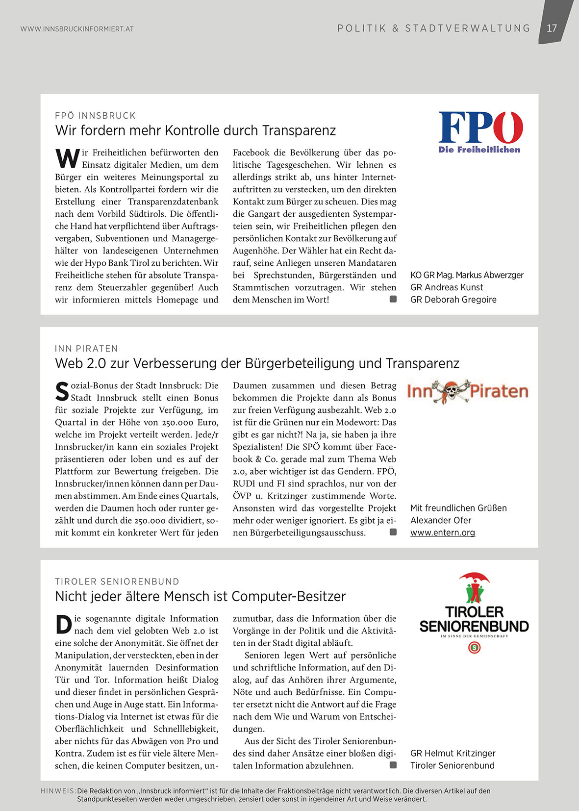 h i n w e i S : Die redaktion von „innsbruck informiert“ ist für die inhalte der fraktionsbeiträge nicht verantwortlich. Die diversen Artikel auf den