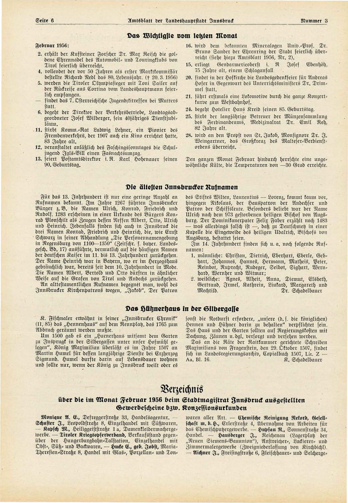 über die im Monat Februar 1956 beim Stadtmagistrat Innsbruck ausgestellten