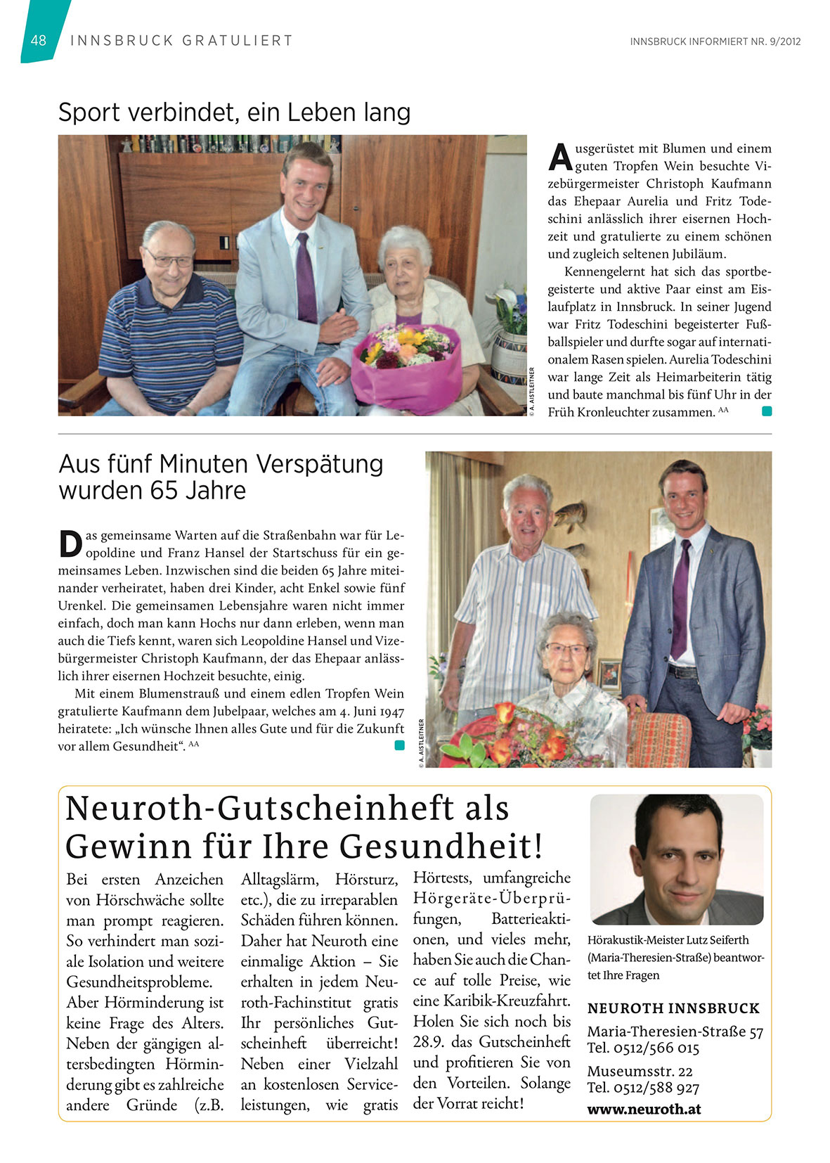 auch die Tiefs kennt, waren sich Leopoldine Hansel und Vizebürgermeister Christoph Kaufmann, der das Ehepaar anlässlich ihrer eisernen Hochzeit besuchte, einig.