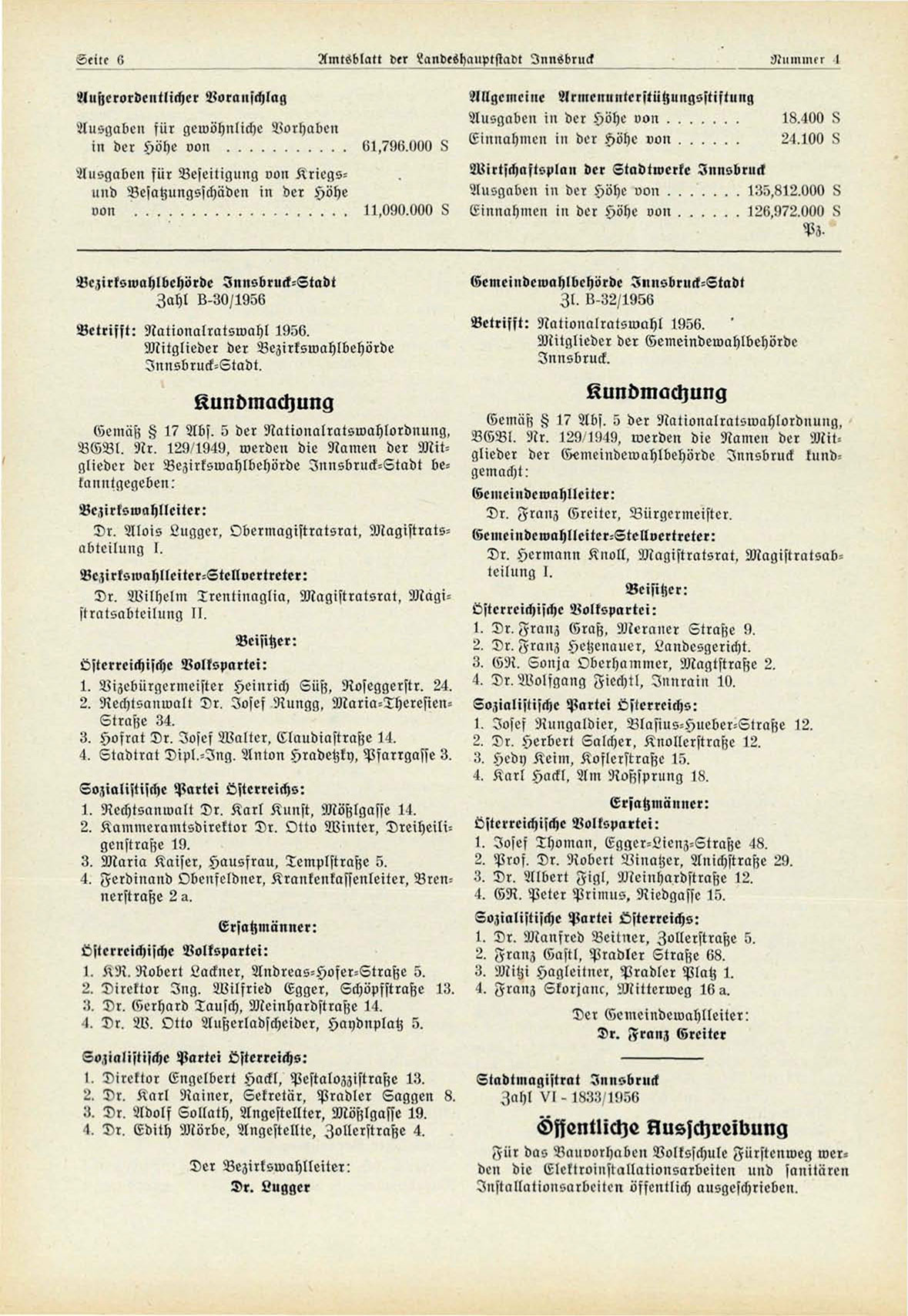 NTVl. Nr. 129/1949, werden die Namen der Mitglieder der Vezirkswahlbehörde Innsbruck-Stadt bekanntgegeben"