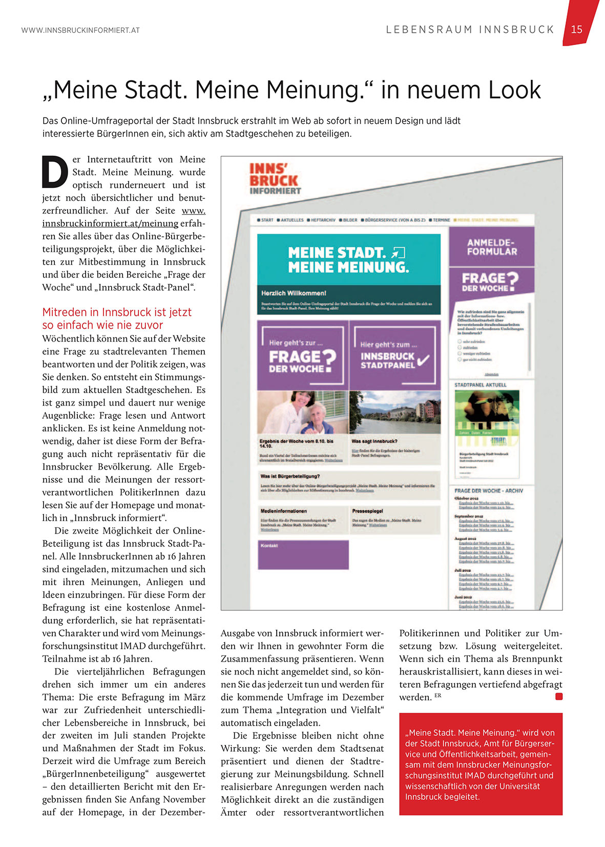 innsbruckinformiert.at/meinung erfahren Sie alles über das Online-Bürgerbeteiligungsprojekt, über die Möglichkeiten zur Mitbestimmung in Innsbruck