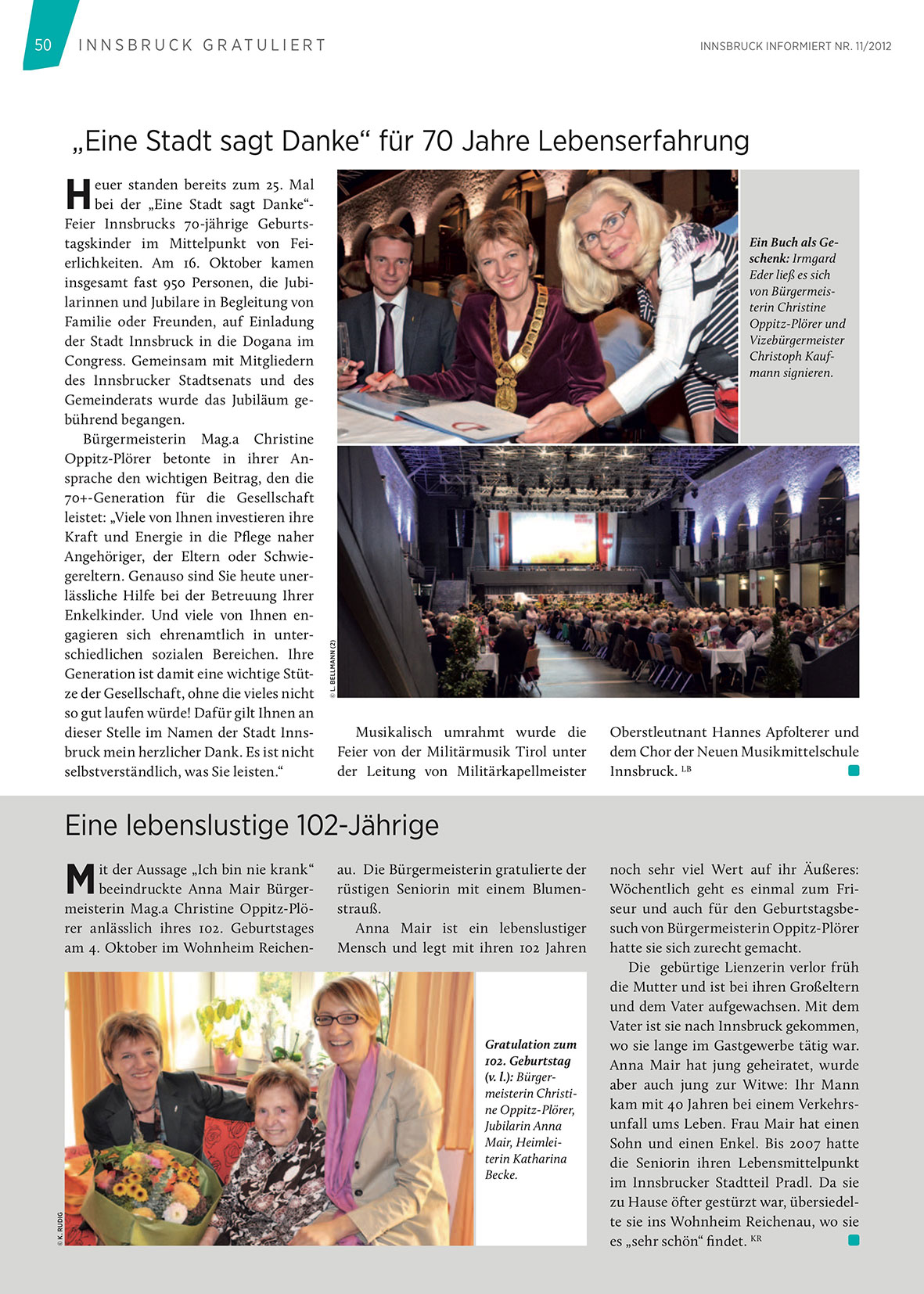 bei der „Eine Stadt sagt Danke“Feier Innsbrucks 70-jährige Geburtstagskinder im Mittelpunkt von Feierlichkeiten. Am 16. Oktober kamen