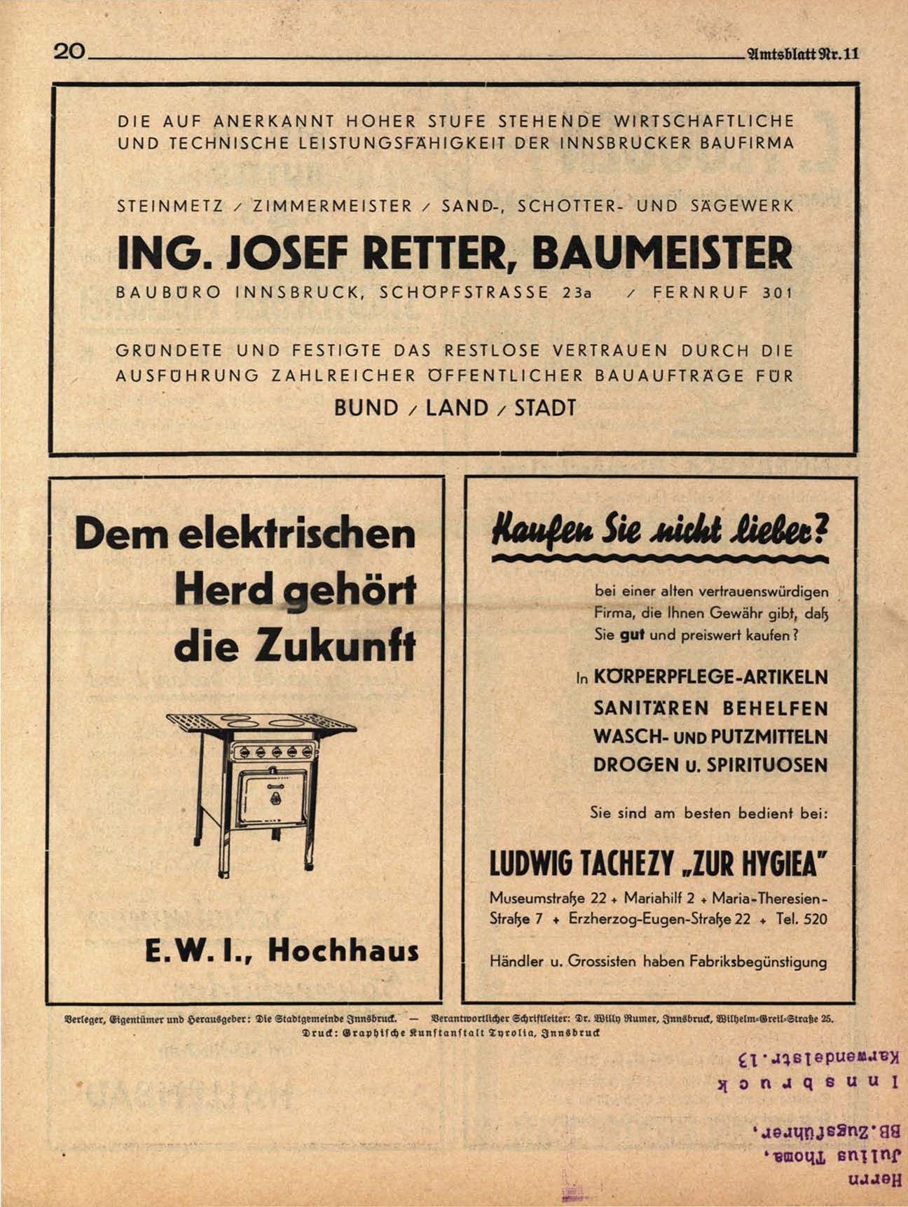 Verleger, Eigentümer und Herausgeber: Die Stadtgrmetnde Innsbruck. — Verantwortlicher Schriftleiter: Dr. Willy Rumer, Innsbruck, Wilhelm-Nreil-Straße 25.