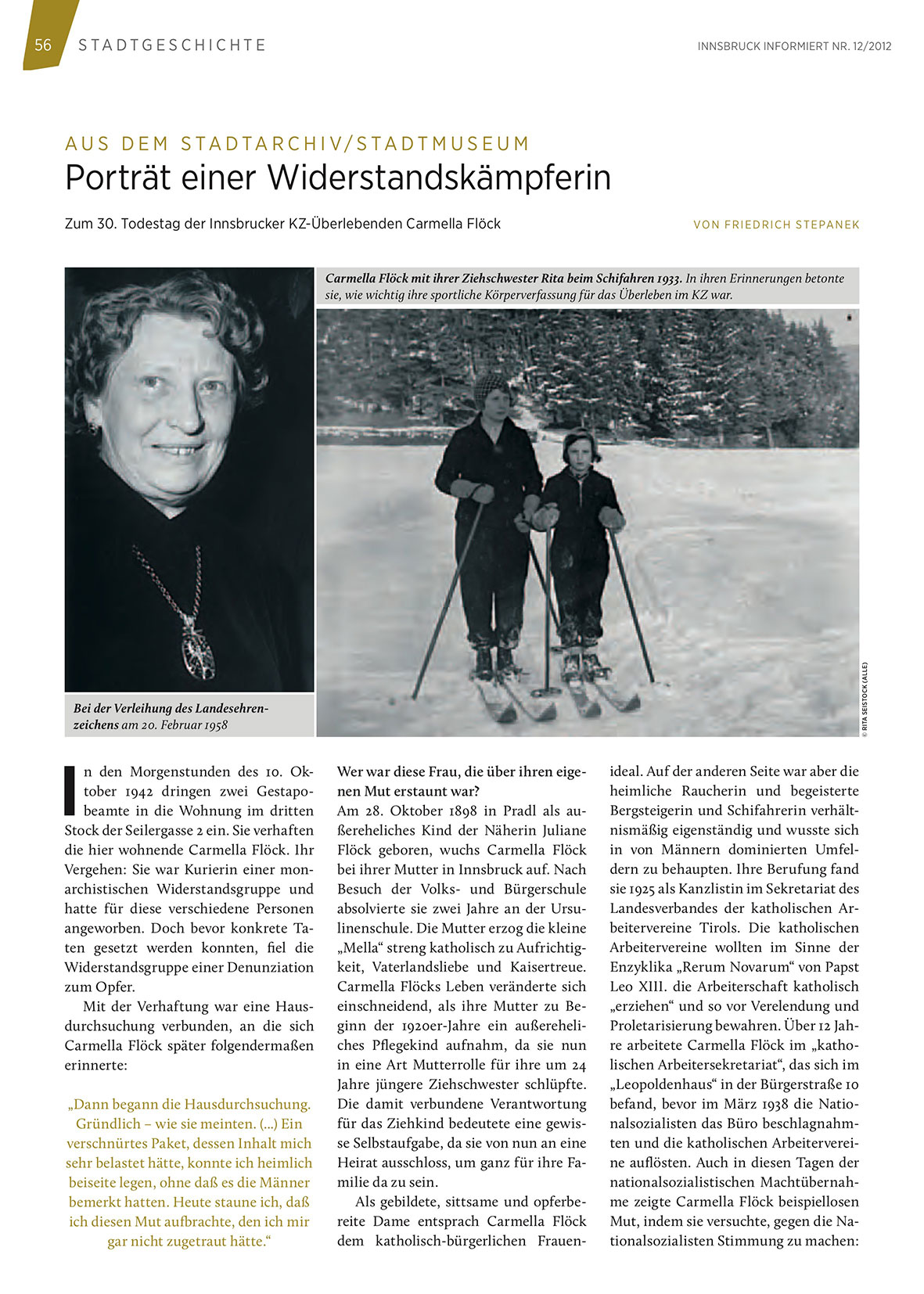Zum 30. Todestag der Innsbrucker KZ-Überlebenden Carmella Flöck