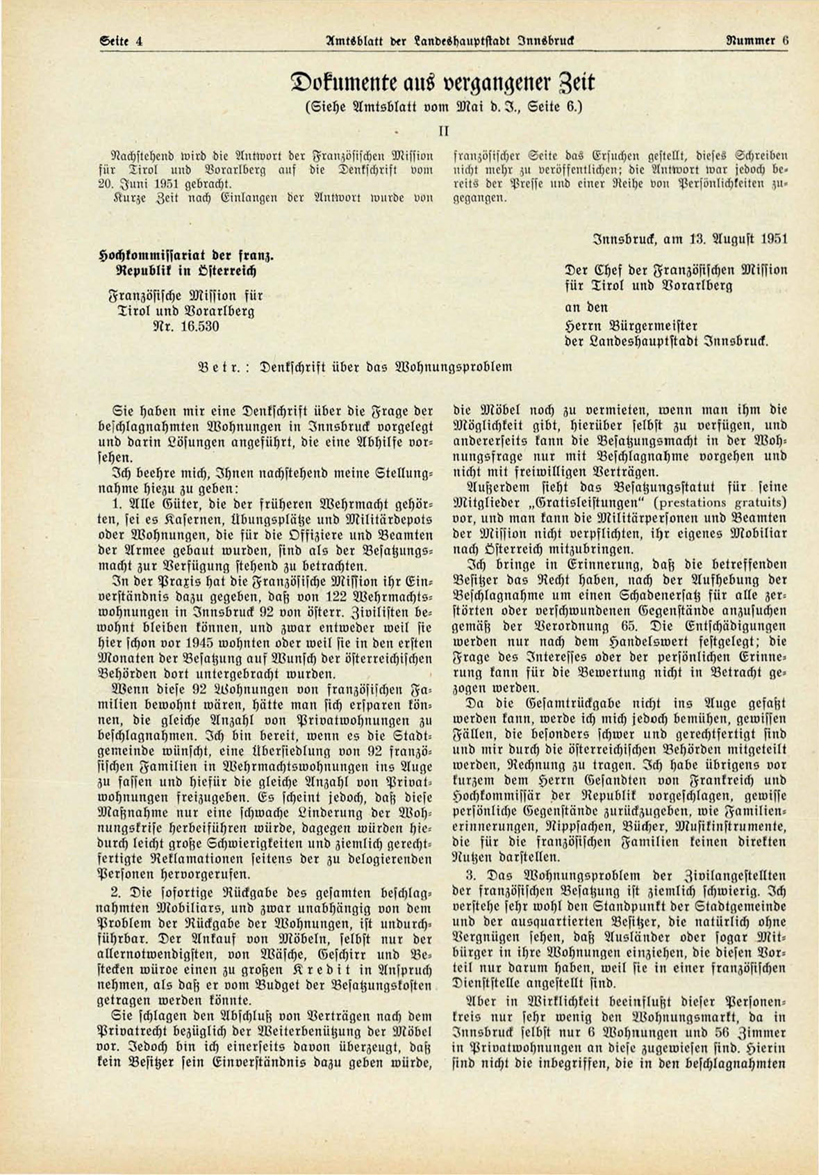 beschlagnahmen. Ich bin bereit, wenn es die Stadtgemeinde wünscht, eine Übersiedlung von 92 französischen Familien in Wehrmachtswohnungen ins Auge