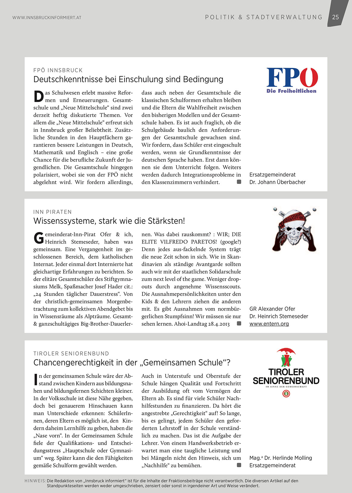 H i n W E i S : die redaktion von „innsbruck informiert“ ist für die inhalte der Fraktionsbeiträge nicht verantwortlich. die diversen Artikel auf den