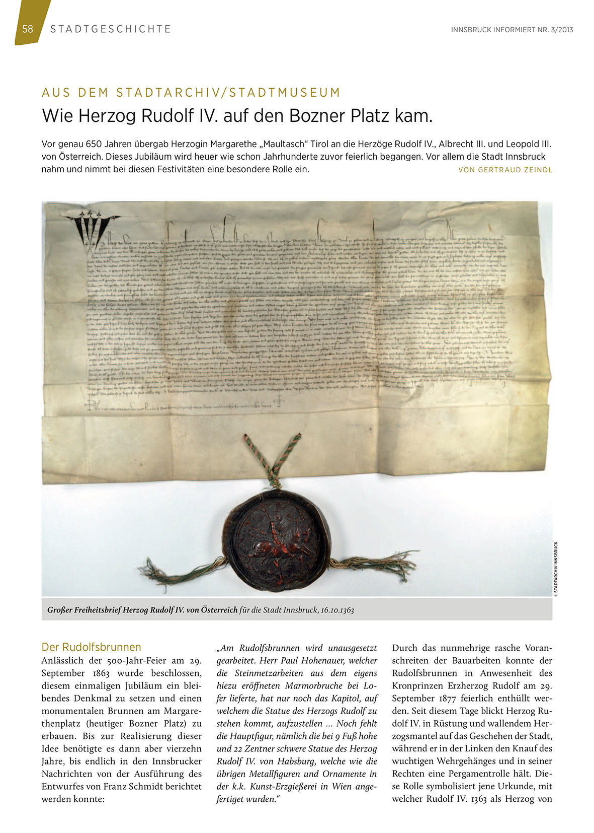 September 1877 feierlich enthüllt werden. Seit diesem Tage blickt Herzog Rudolf IV. in Rüstung und wallendem Herzogsmantel auf das Geschehen der Stadt,
