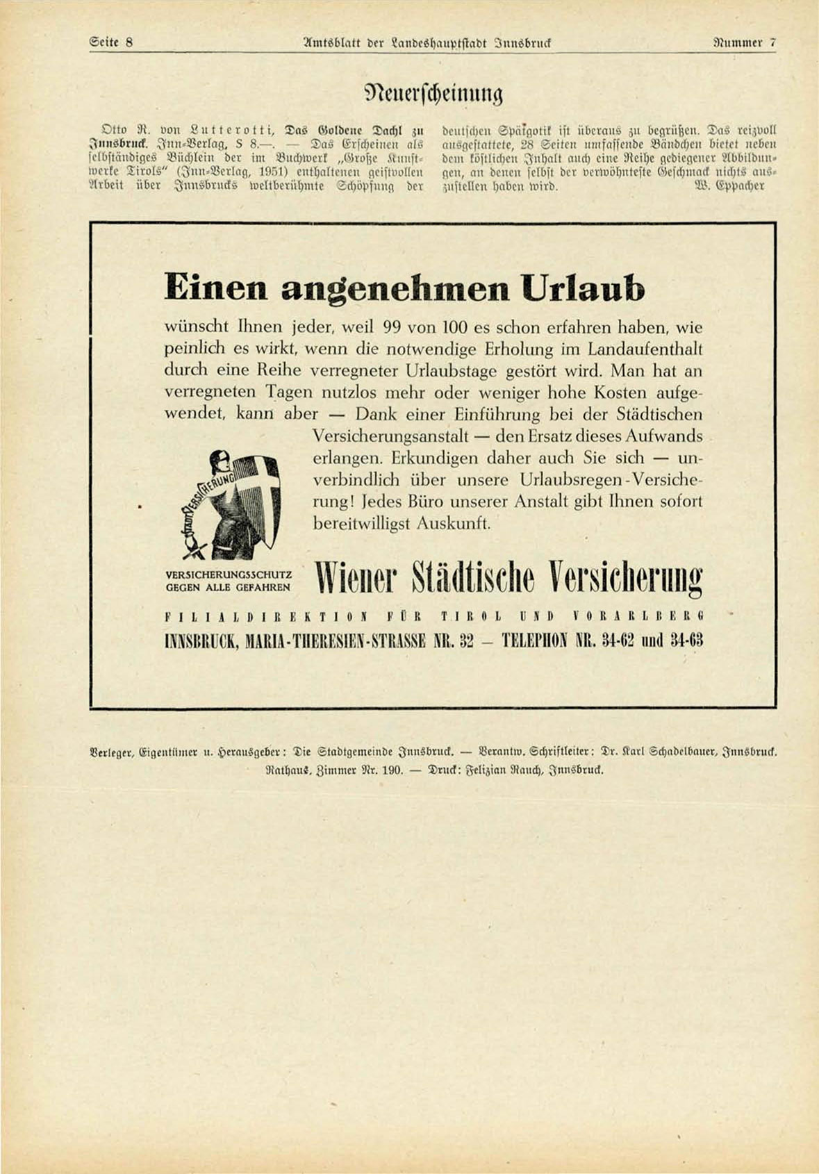Verleger, Eigentiiiller U.Herausgeber: Die Stadtgemeinde Innsbruck. — Verantw. Schriftleiter: Dr. Karl Schadelbauer, Innsbruck.