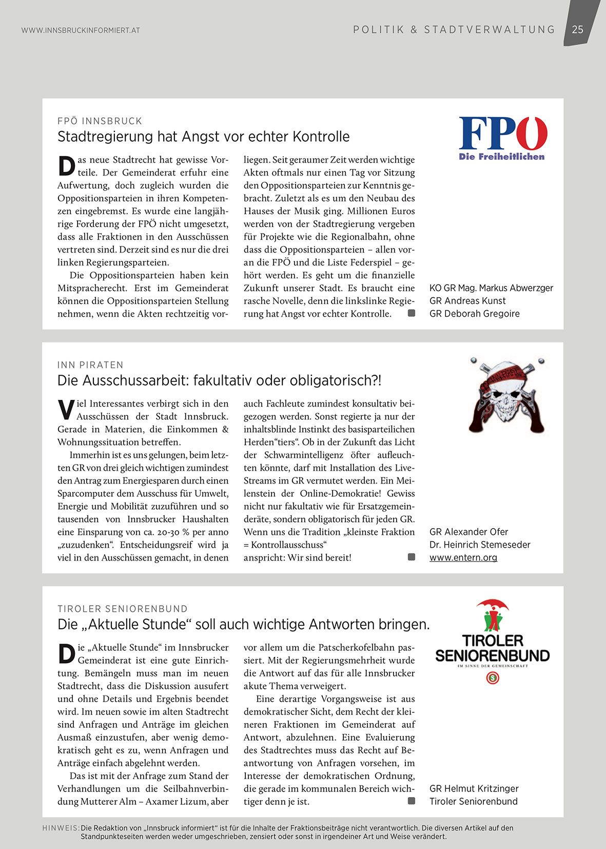 H I n w e I S : Die Redaktion von „Innsbruck informiert“ ist für die Inhalte der fraktionsbeiträge nicht verantwortlich. Die diversen artikel auf den