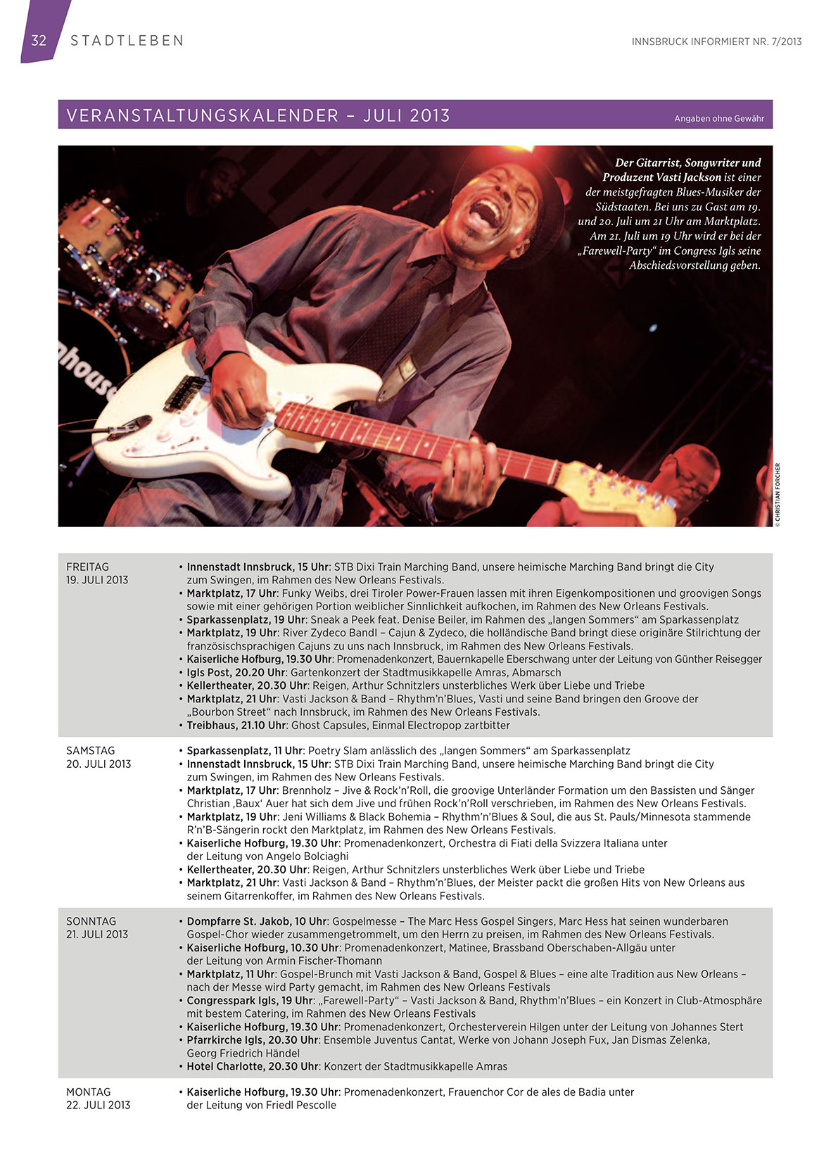 • Congresspark Igls, 19 Uhr: „Farewell-Party“ – Vasti Jackson & Band, Rhythm’n’Blues – ein Konzert in Club-Atmosphäre