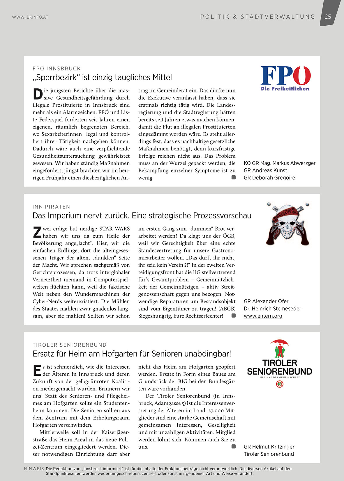 H i n w e i S : die redaktion von „innsbruck informiert“ ist für die inhalte der fraktionsbeiträge nicht verantwortlich. die diversen artikel auf den