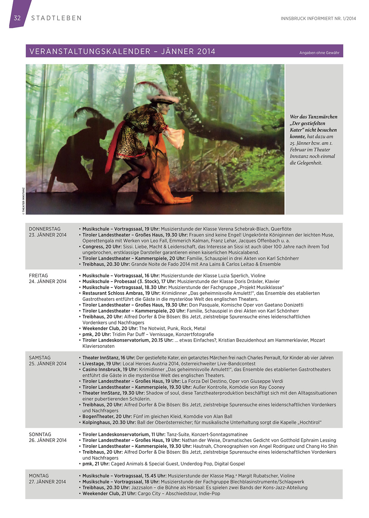 • Theater InnStanz, 16 Uhr: Der gestiefelte Kater, ein getanztes Märchen frei nach Charles Perrault, für Kinder ab vier Jahren