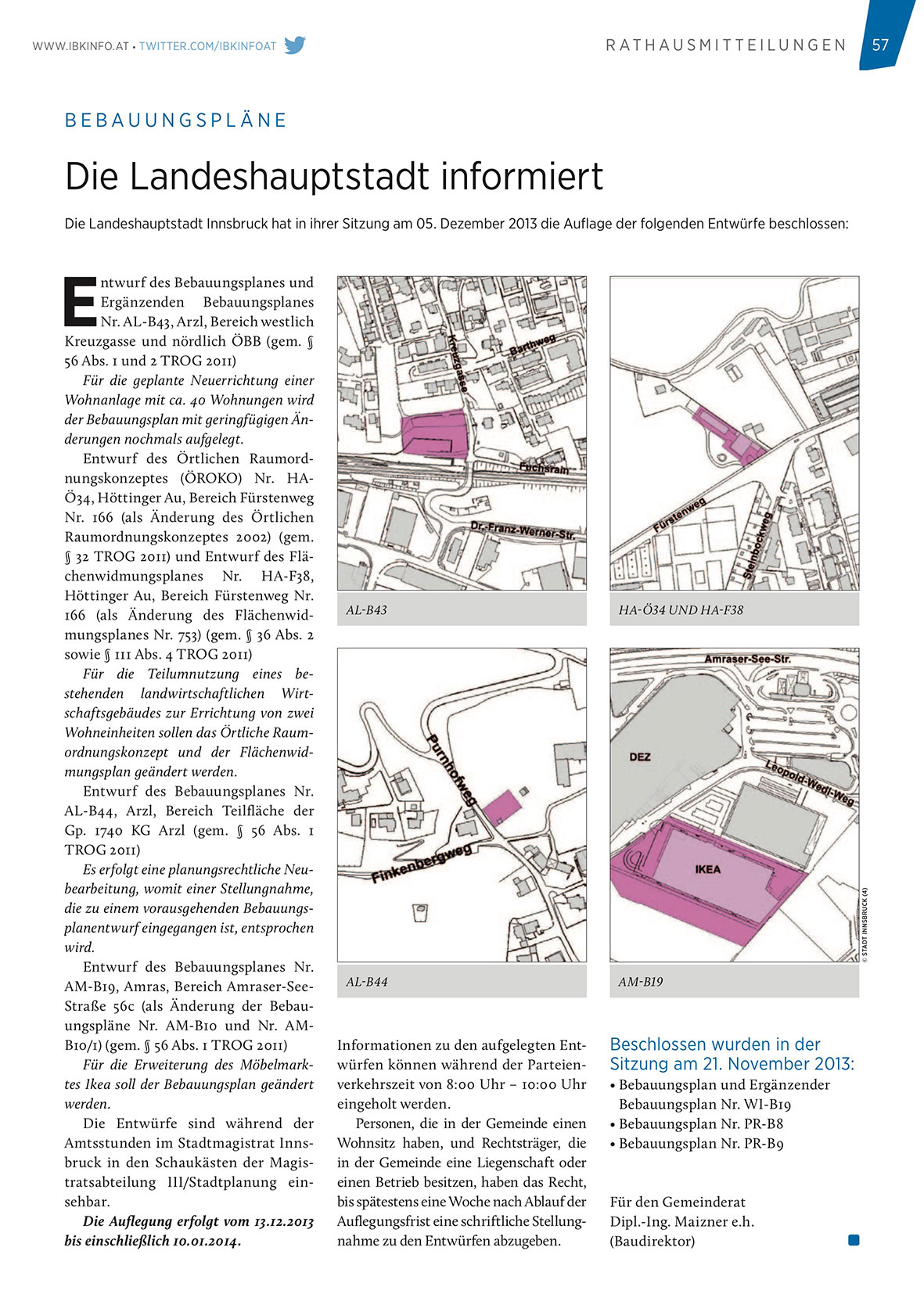 die landeshauptstadt Innsbruck hat in ihrer sitzung am 05. dezember 2013 die auflage der folgenden entwürfe beschlossen: