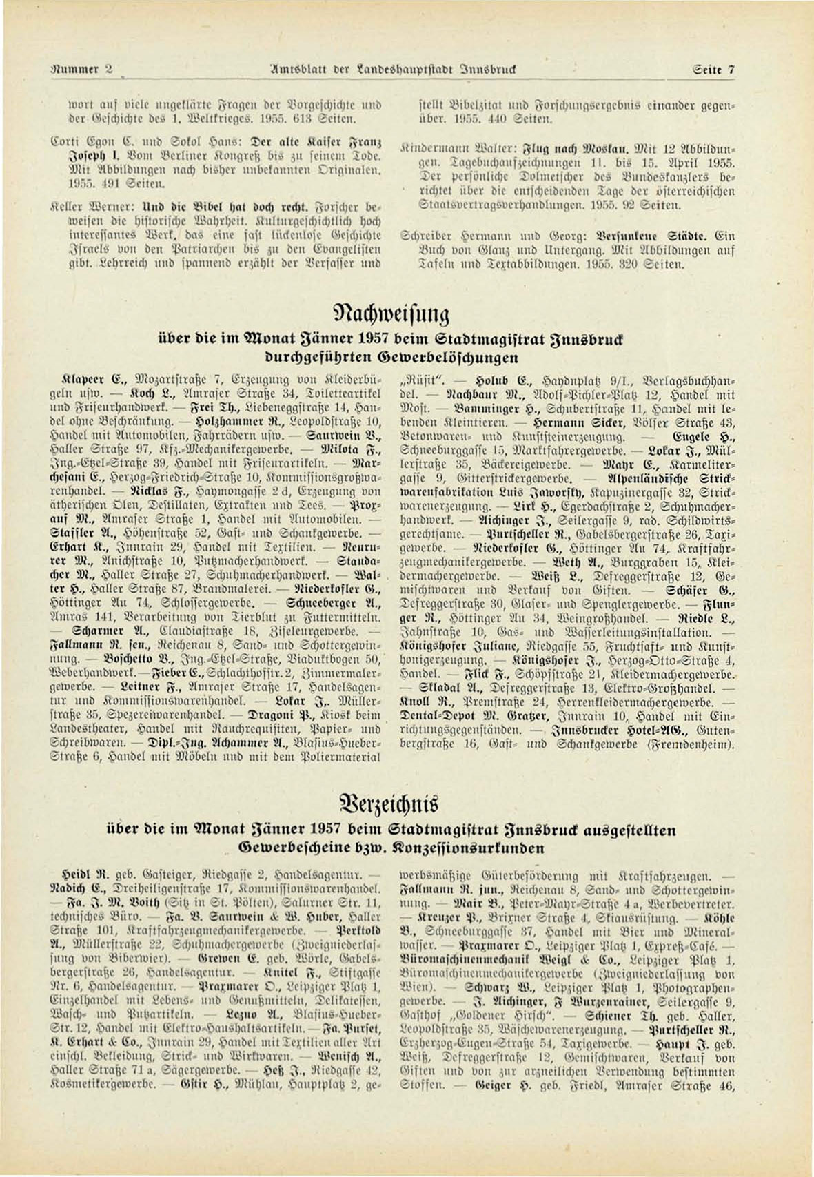 über die im Monat Jänner 1957 beim Stadtmagistrat Innsbruck