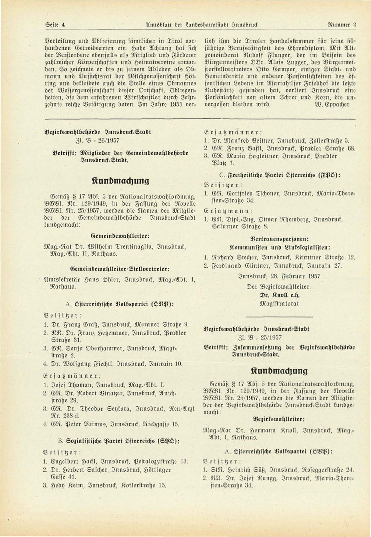 VGBl. Nr. 25/1957, werden die Namen der Mitglieder der Vezirksroahlbehörde Innsbruck-Stadt kundgemacht: