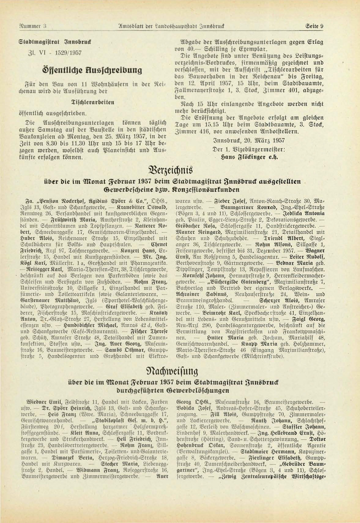 über die im Monat Februar 1957 beim Stadtmagistrat Innsbruck ausgestellten