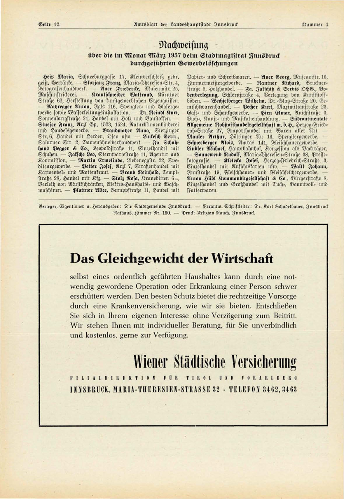 Verleger, Eigentümer u. Herausgeber: Die Stadtgemeinde Innsbruck. — Verantw. Schriftleiter: Tr. Karl Schadelbauer, Innsbruck