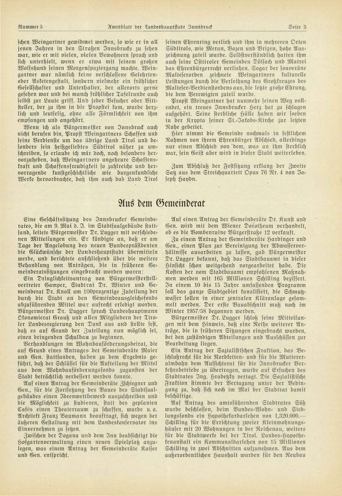 Eine Geschäftssitzung des Innsbrucks Gemeinderates, die am 9. Mai d. I . im Stadtsaalgebäude stattfand, leitete Bürgermeister Dr. Lugger mit verschiedenen Mitteilungen ein. Er kündigte an, daß er am