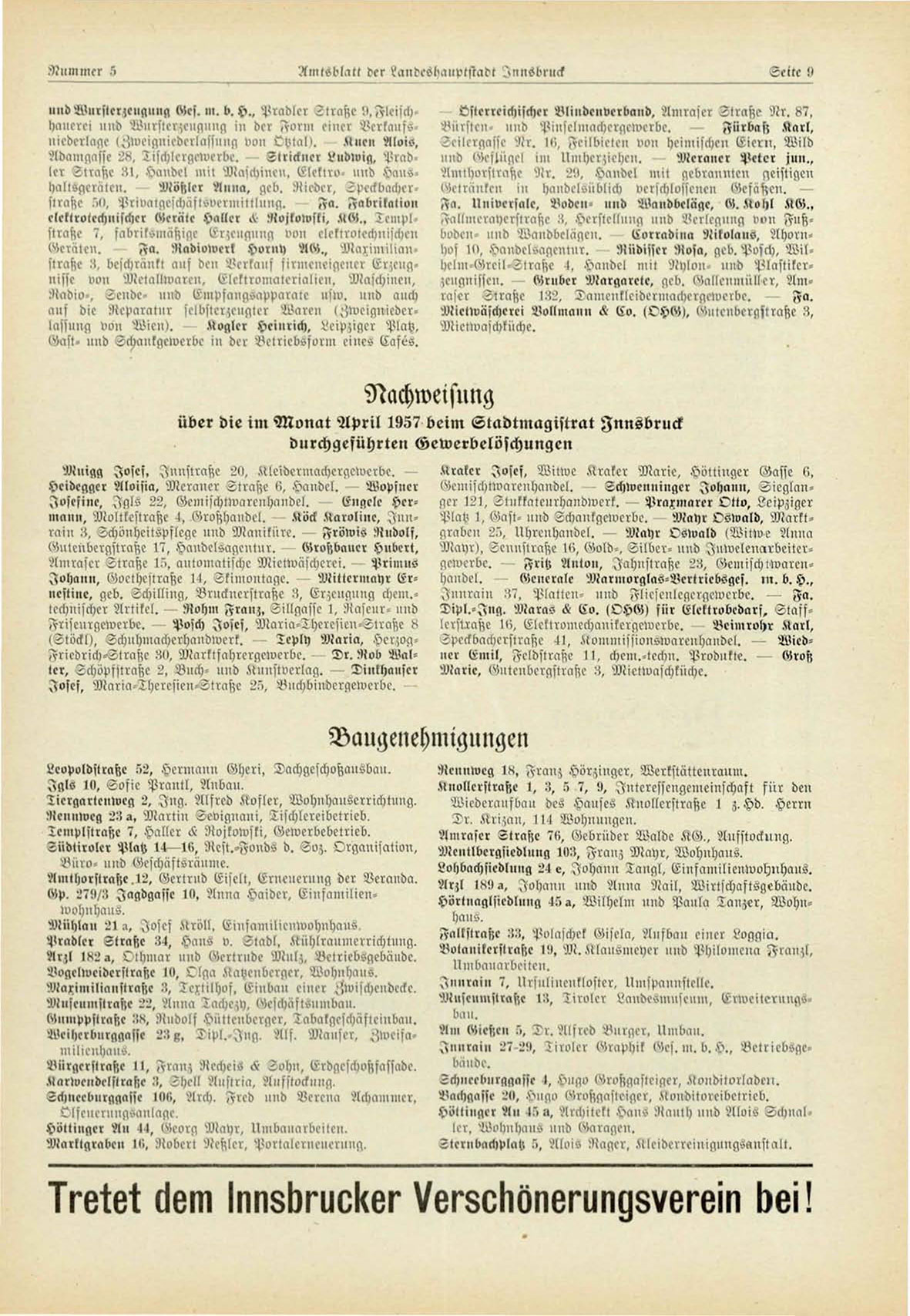über die im Monat April 1957 beim Stadtmagistrat Innsbruck