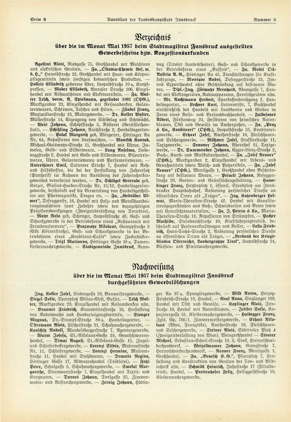 über die im Monat M a i 1957 beim Stadtmagistrat Innsbruck ausgestellten