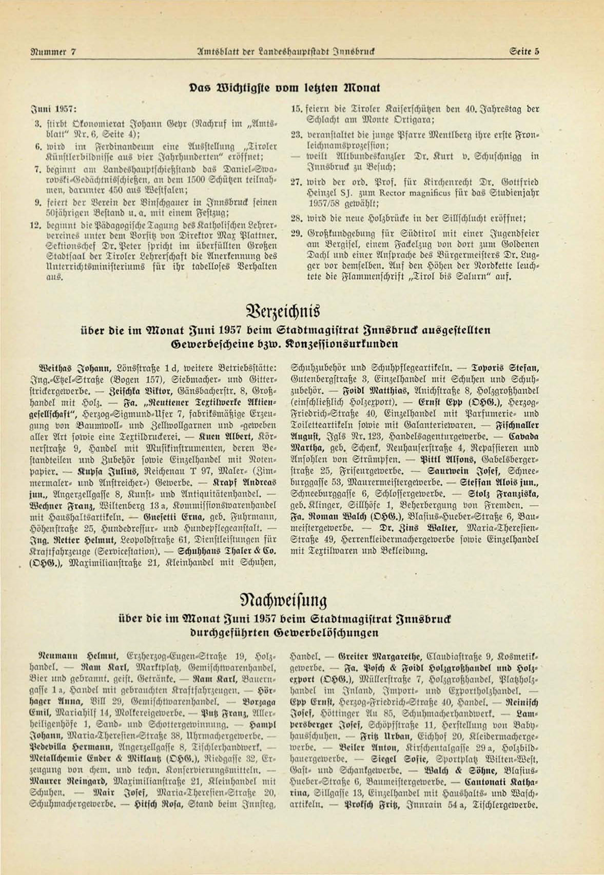 über die im Monat J u n i 1957 beim Stadtmagistrat Innsbruck
