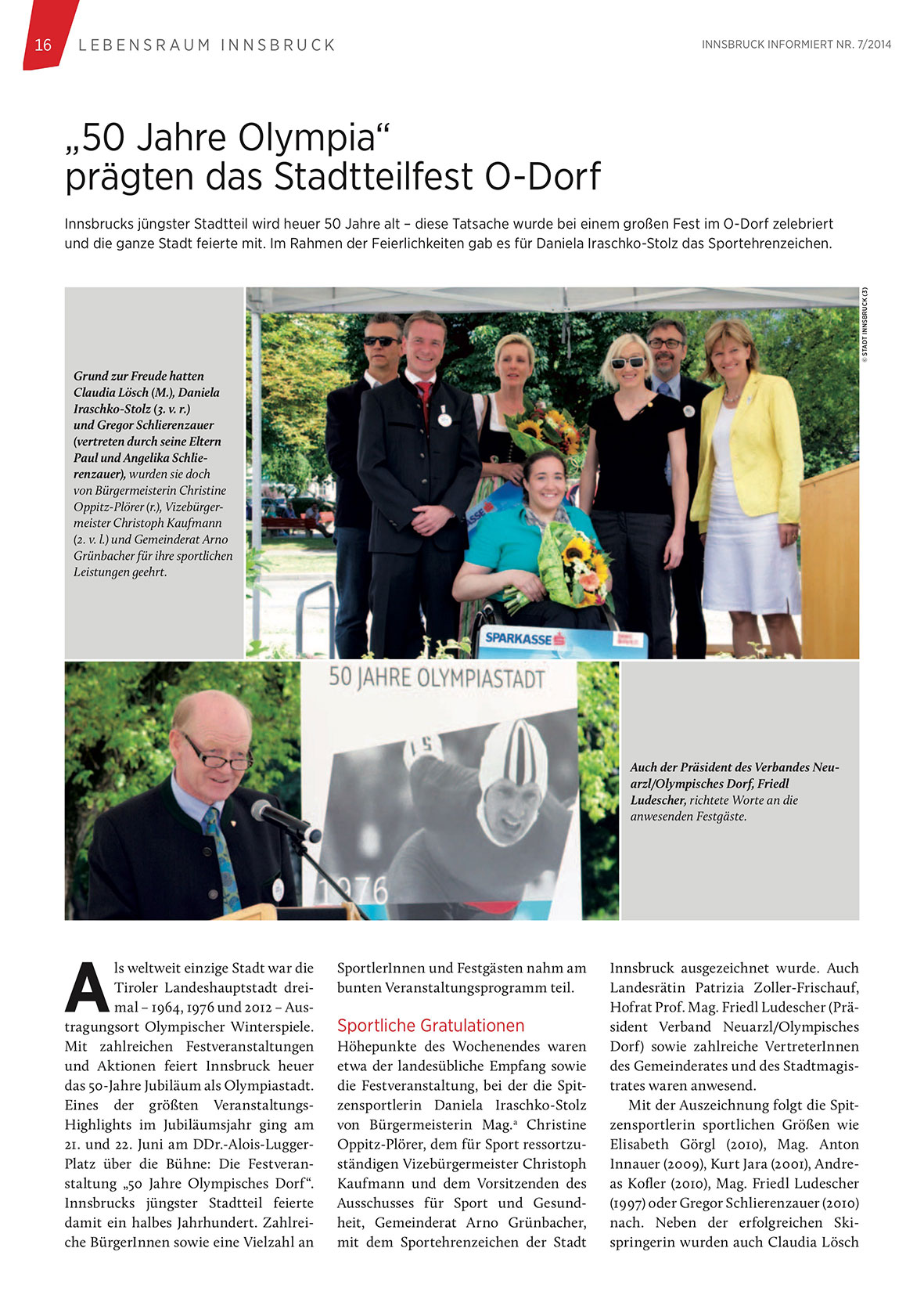 21. und 22. Juni am DDr.-Alois-LuggerPlatz über die Bühne: Die Festveranstaltung „50 Jahre Olympisches Dorf“.