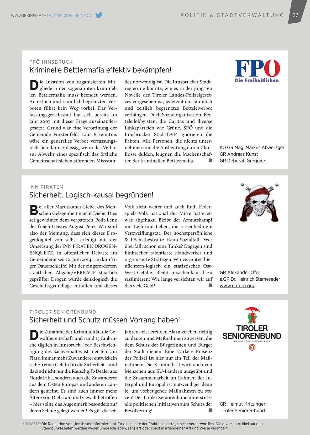 H i n w e i s : Die redaktion von „innsbruck informiert“ ist für die inhalte der fraktionsbeiträge nicht verantwortlich. Die diversen artikel auf den
