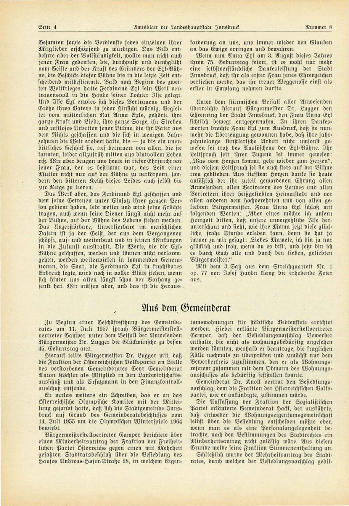 Z u Beginn einer Geschäftsfitzung des Gemeinderates am 11. J u l i 1957 sprach Vürgermeifterstelluertreter Gamper unter dem Beifall der Anwesenden