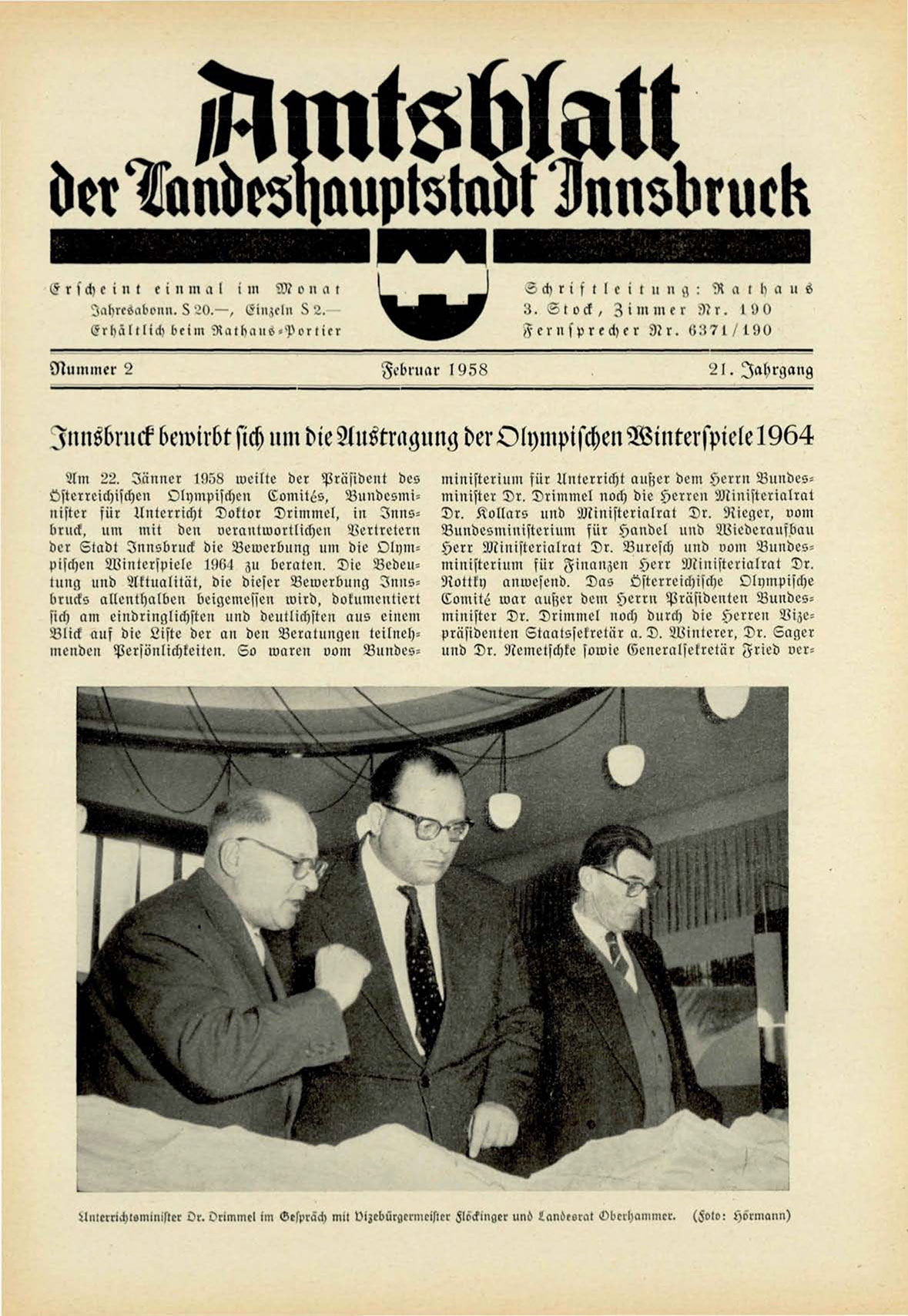 der Stadt Innsbruck die Bewerbung um die Olympischen Winterspiele 1964 zu beraten. Die Bedeutung und Aktualität, die dieser Bewerbung Innsbrucks allenthalben beigemessen wird, dokumentiert