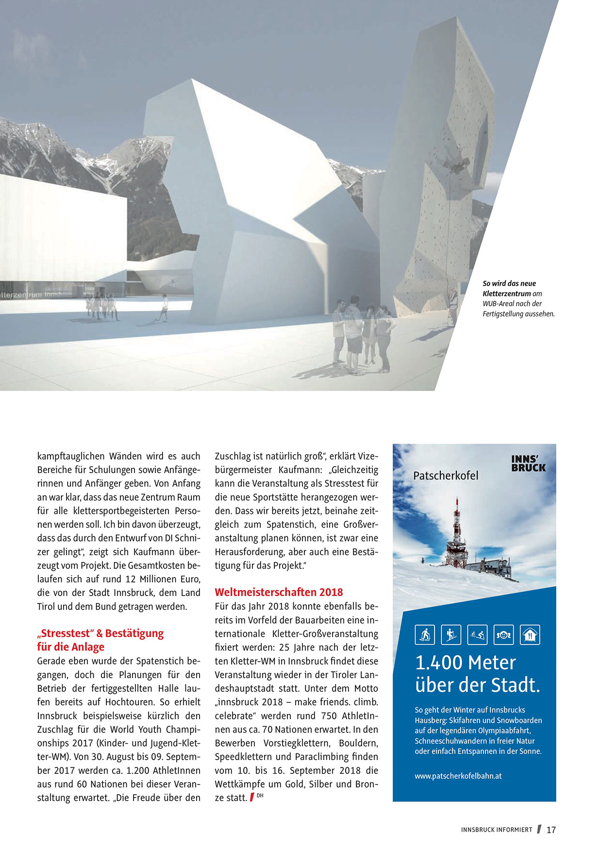 Zuschlag für die World Youth Championships 2017 (Kinder- und Jugend-Kletter-WM). Von 30. August bis 09. September 2017 werden ca. 1.200 AthletInnen