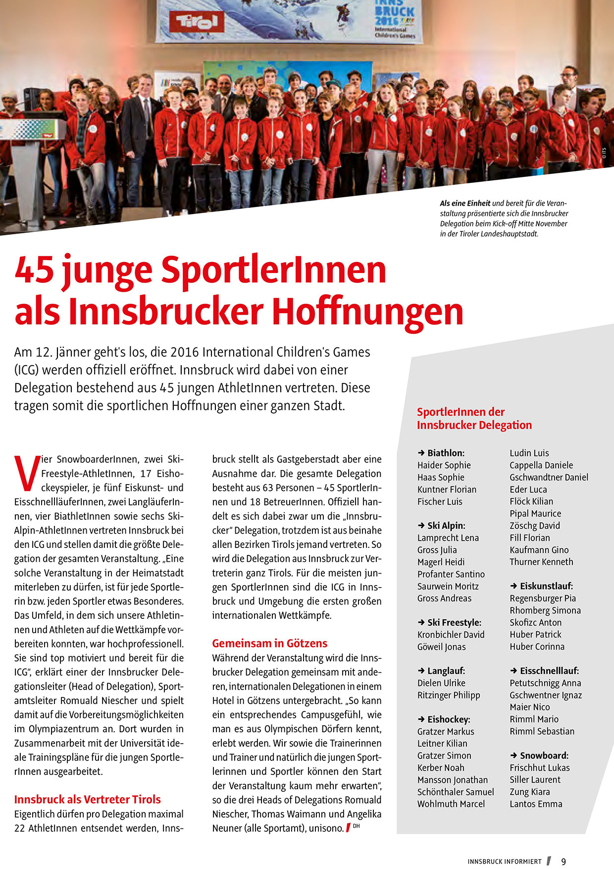 besteht aus 63 Personen – 45 SportlerInnen und 18 BetreuerInnen . Offiziell handelt es sich dabei zwar um die „Innsbrucker“ Delegation, trotzdem ist aus beinahe