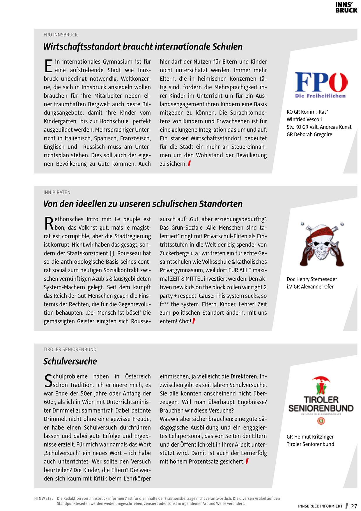 H I N W EI S : Die Redaktion von „Innsbruck informiert“ ist für die Inhalte der Fraktionsbeiträge nicht verantwortlich . Die diversen Artikel auf den