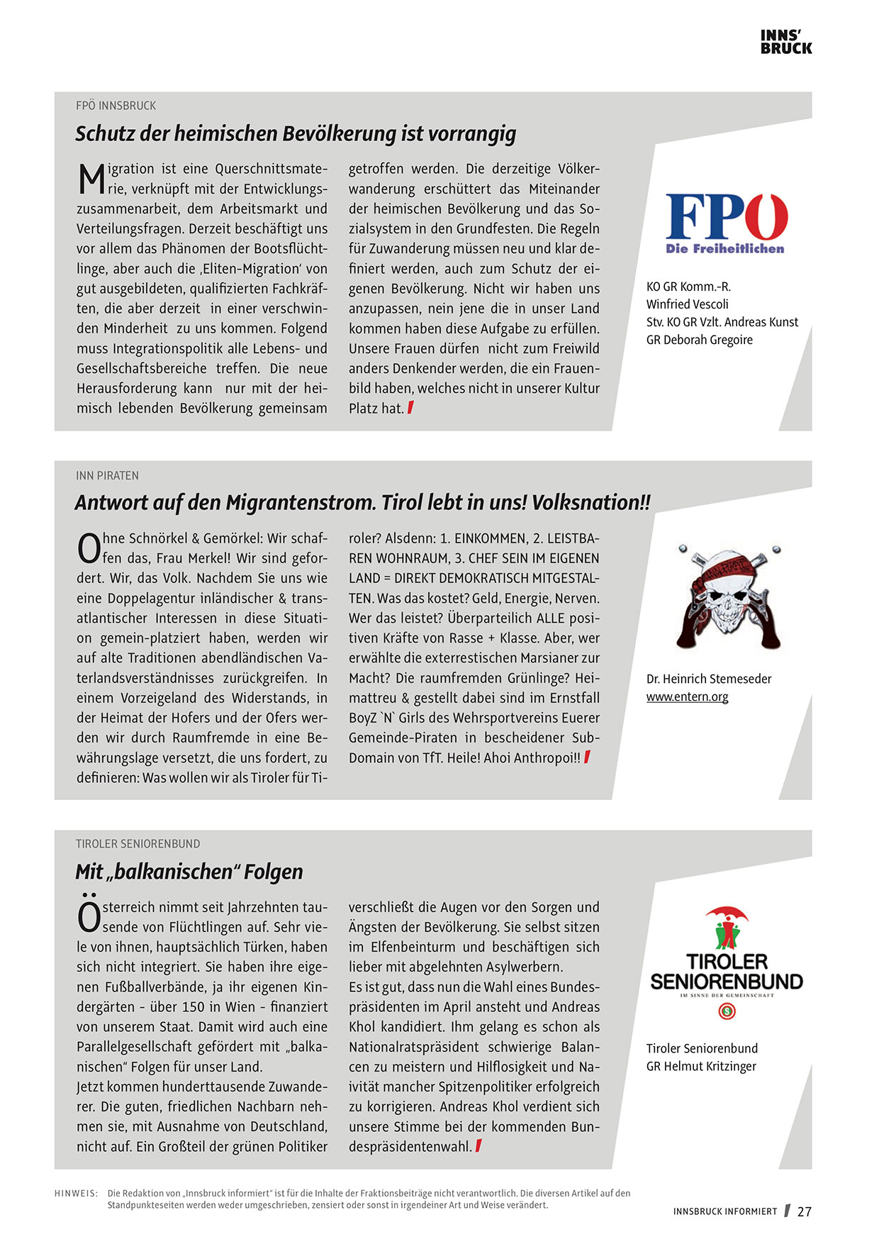 H I N W EI S : Die Redaktion von „Innsbruck informiert“ ist für die Inhalte der Fraktionsbeiträge nicht verantwortlich. Die diversen Artikel auf den