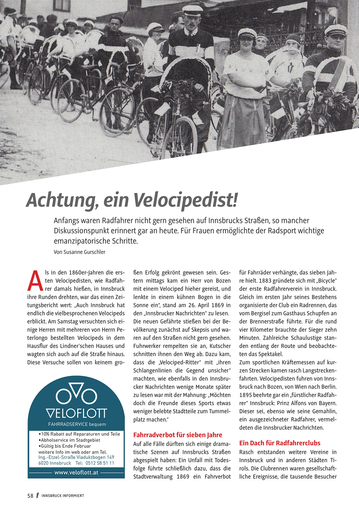 ls in den 1860er-Jahren die ersten Velocipedisten, wie Radfahrer damals hießen, in Innsbruck