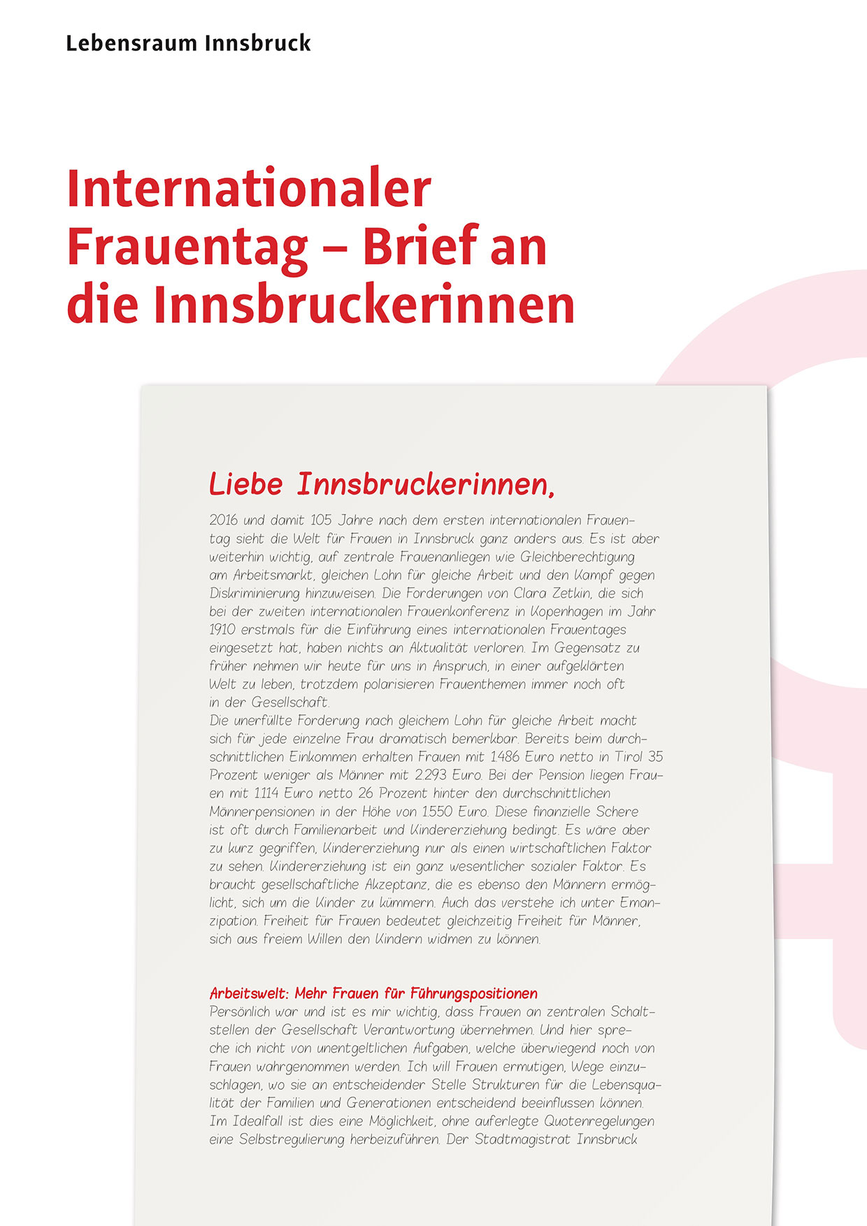 2016 und damit 105 Jahre nach dem ersten internationalen Frauentag sieht die Welt für Frauen in Innsbruck ganz anders aus. Es ist aber