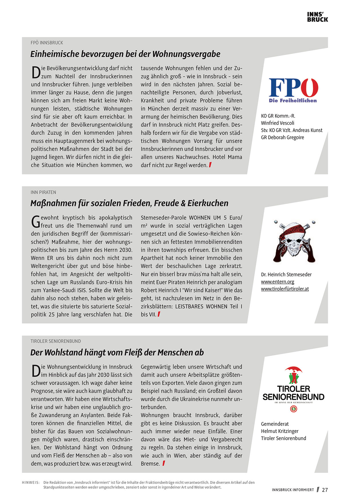 H I N W EI S : Die Redaktion von „Innsbruck informiert“ ist für die Inhalte der Fraktionsbeiträge nicht verantwortlich . Die diversen Artikel auf den