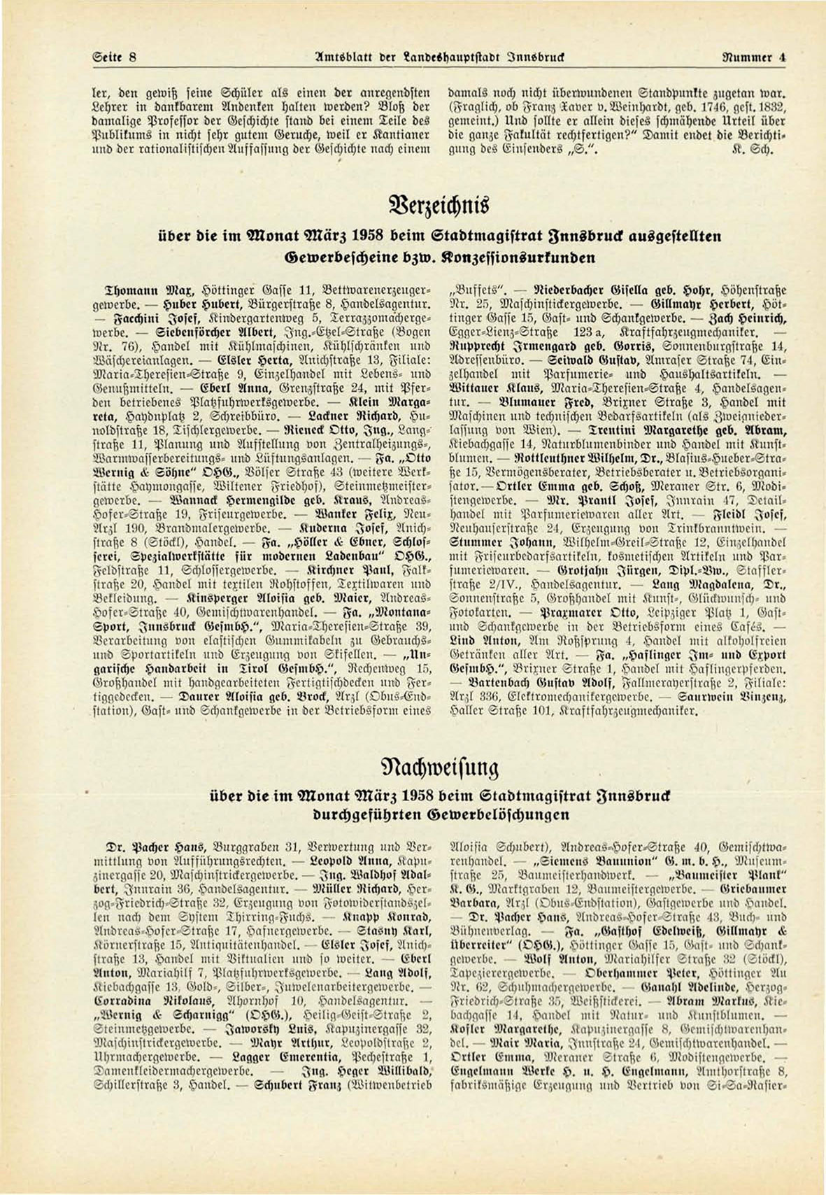 über die im Monat März 1958 beim Stadtmagistrat Innsbruck
