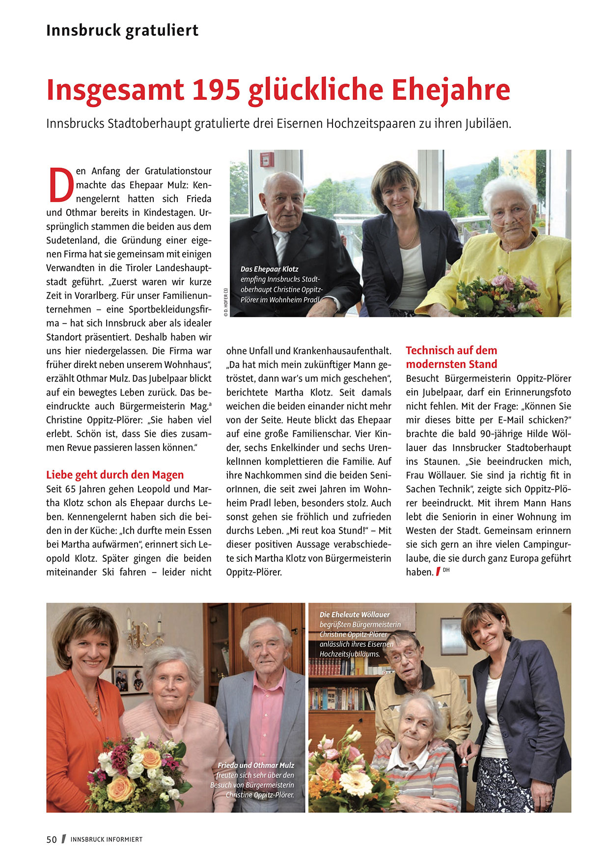 Innsbrucks Stadtoberhaupt gratulierte drei Eisernen Hochzeitspaaren zu ihren Jubiläen.