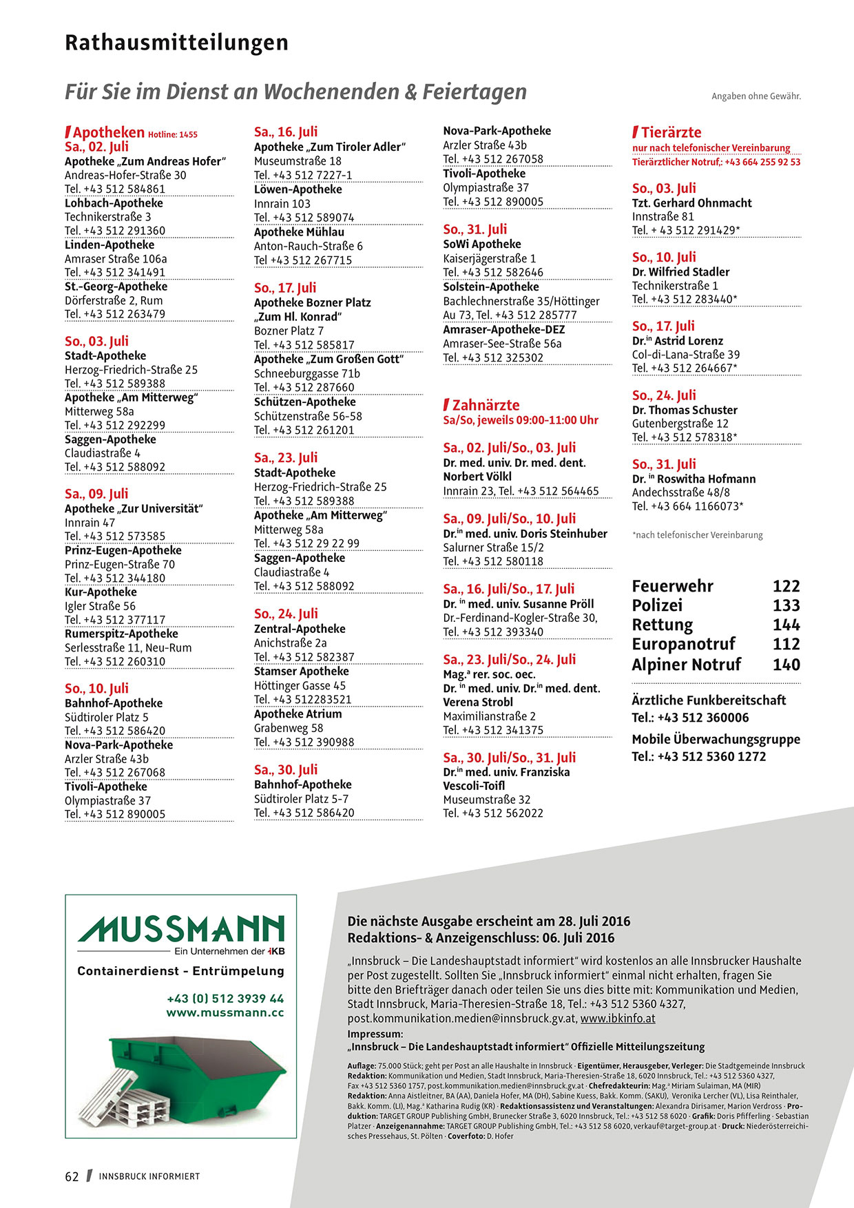 Auflage: 75.000 Stück; geht per Post an alle Haushalte in Innsbruck · Eigentümer, Herausgeber, Verleger: Die Stadtgemeinde Innsbruck