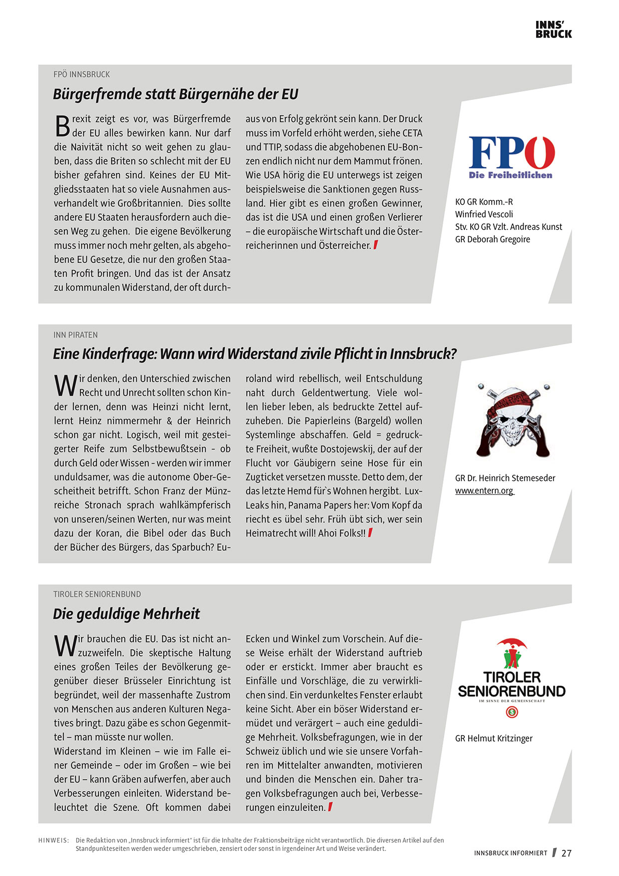 H I N W EI S : Die Redaktion von „Innsbruck informiert“ ist für die Inhalte der Fraktionsbeiträge nicht verantwortlich . Die diversen Artikel auf den