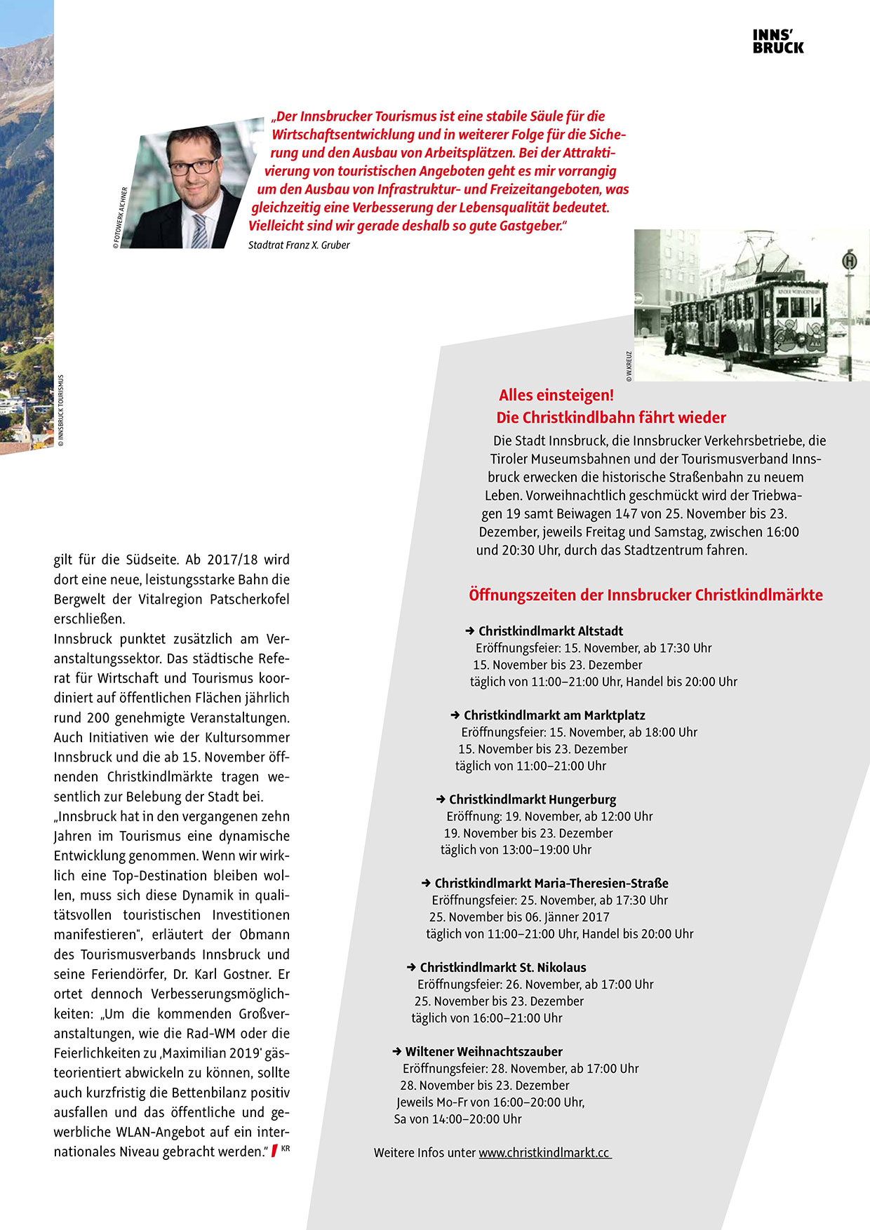 Innsbruck und die ab 15. November öffnenden Christkindlmärkte tragen wesentlich zur Belebung der Stadt bei.
